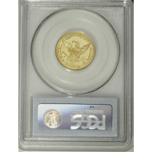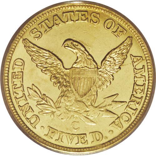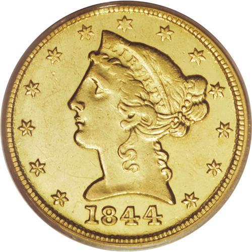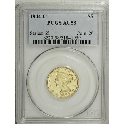 <B>1844-C $5 AU58 PCGS.</B></I> Variety 7-D. A smooth yellow-gold example of this popular low-mintage issue. Bright luster is plentiful on each side, though portions of Liberty's hair and the bottom half of the eagle are softly defined. A bold horizontal die crack travels from the eagle's neck to the reverse rim between 2 and 3 o'clock. Population: 4 in 58, 4 finer (12/06).<BR><BR><b>Shipping:</b> Coin/Currency (<a target="_blank" href="http://www.heritageauctions.com/common/shipping.php">view shipping information</a>)