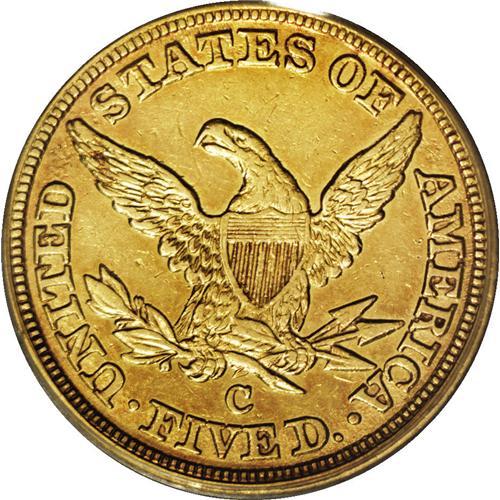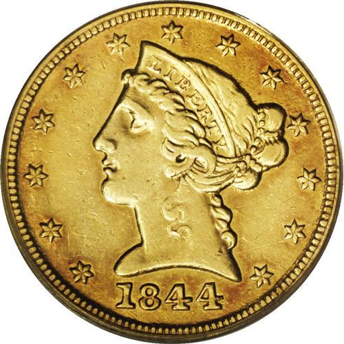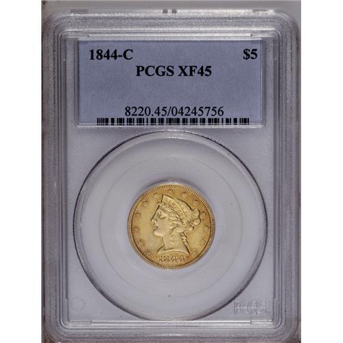 <B>1844-C $5 XF45 PCGS.</B></I> Variety 7-D. This appears to be an earlier die state without evidence of any die cracks, clash marks, or other die defects on either side. The surfaces have light scratches and minor abrasions with considerable peripheral roughness on both sides. Mostly green-gold with splashes of pale orange color near the borders.