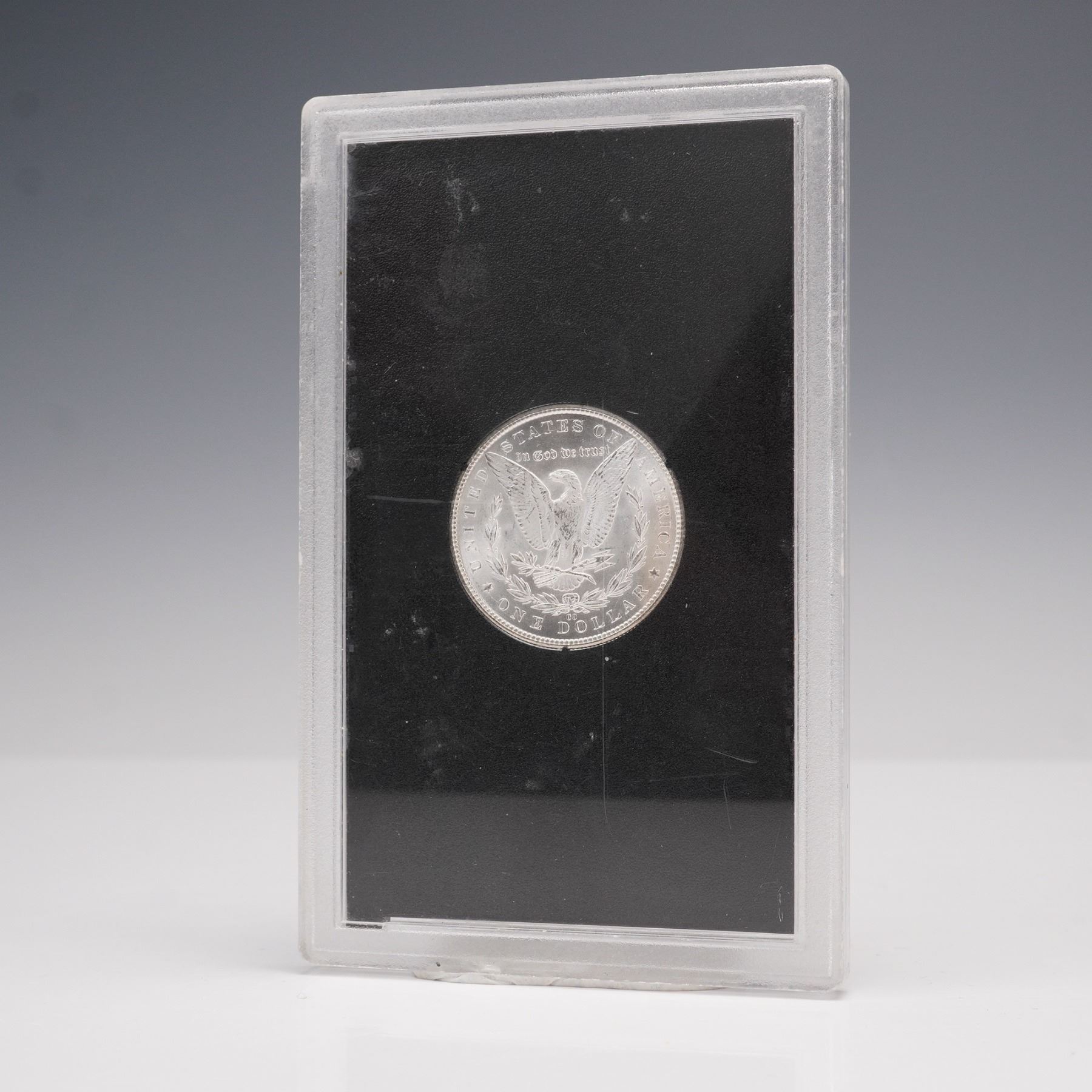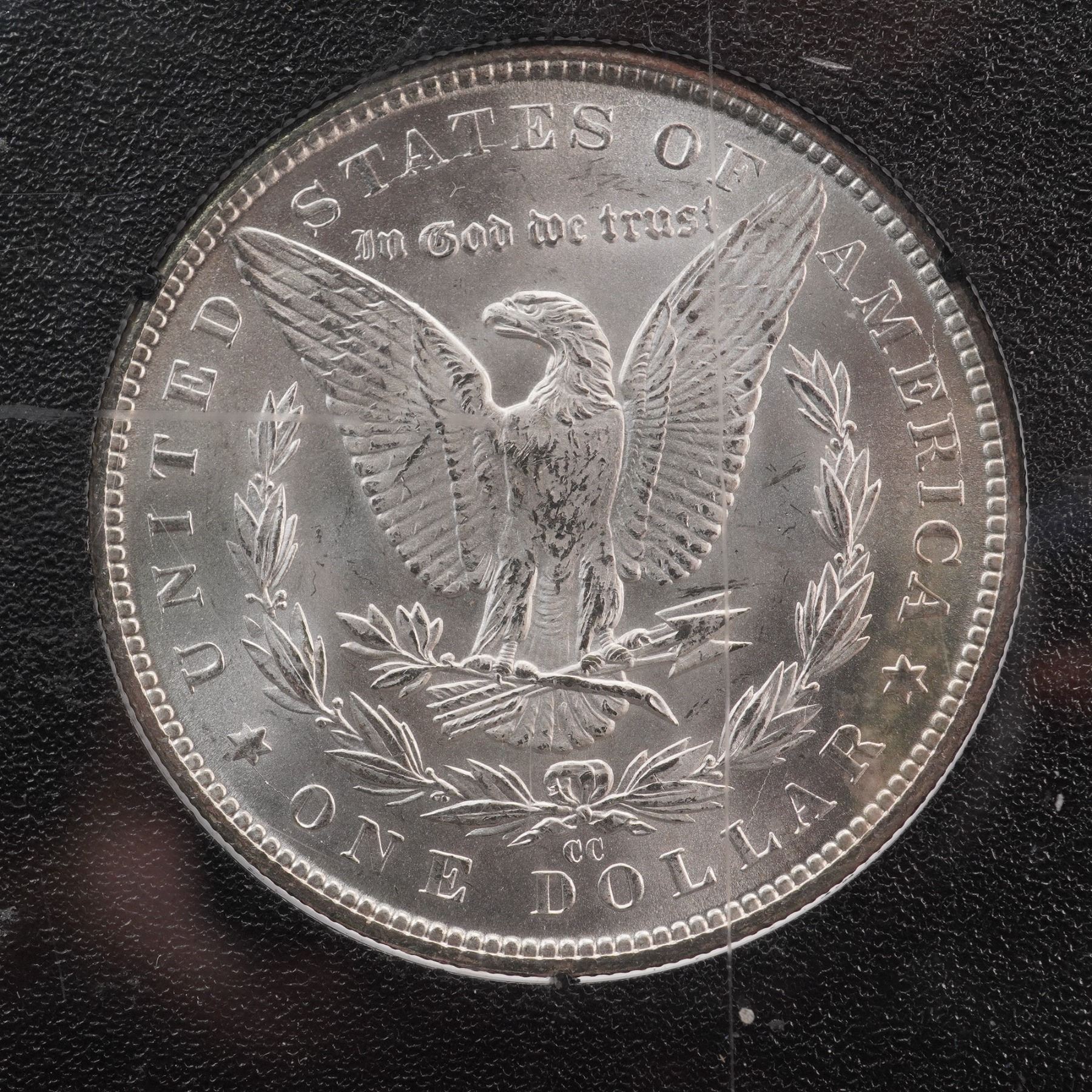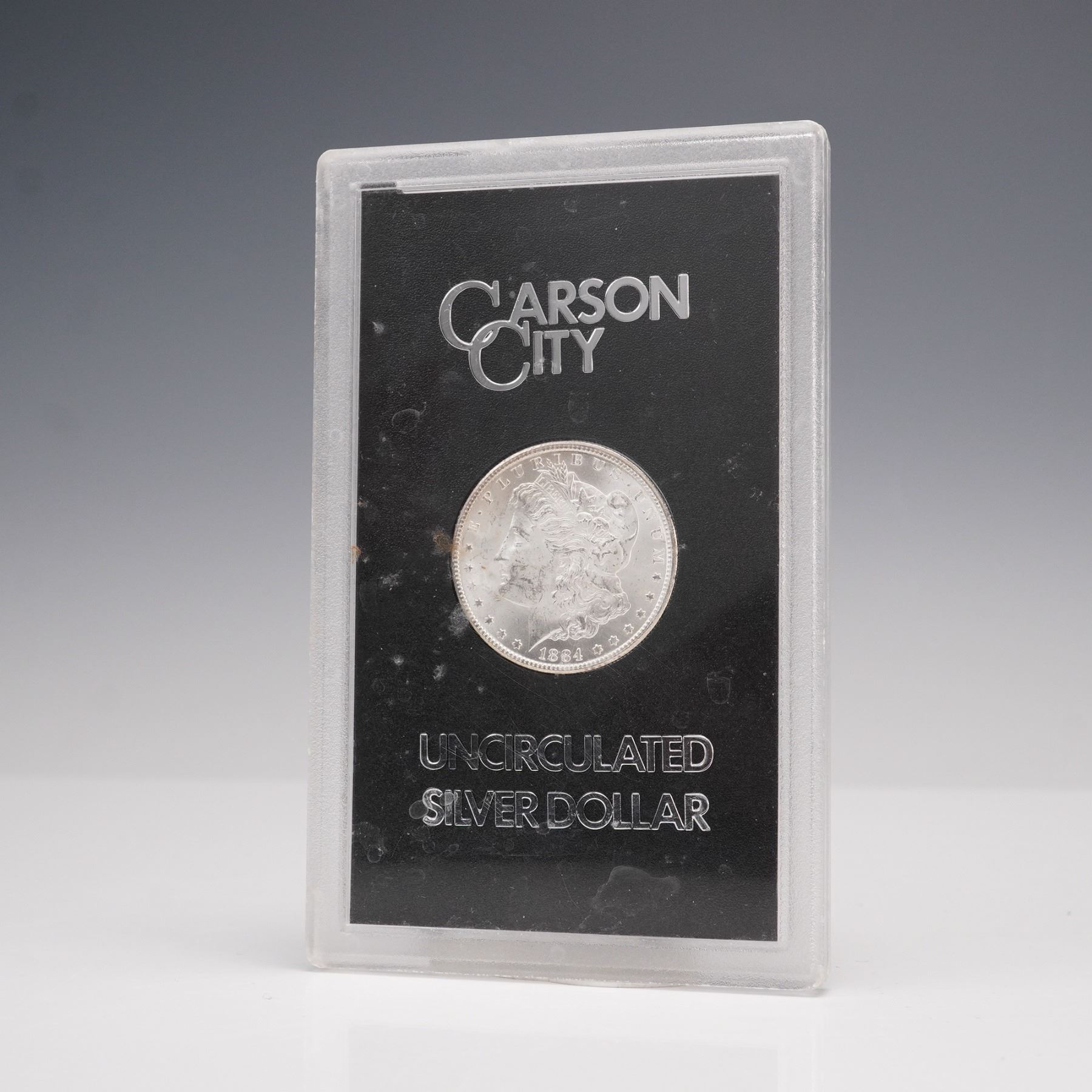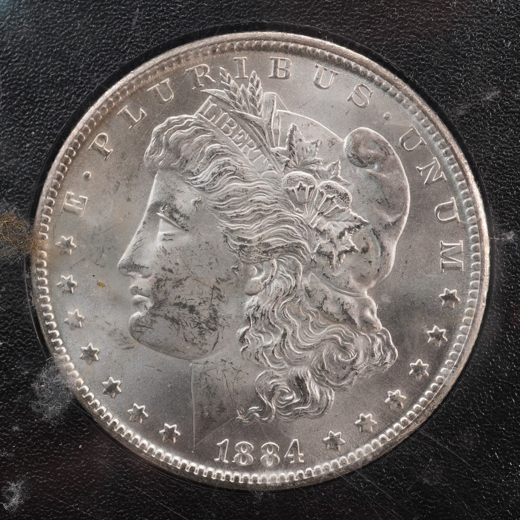 An 1884-CC Morgan Silver Dollar from the U.S. Carson City Mint. The historic Carson City dollars, struck at the Nevada mint known for producing some of the most coveted coins in American numismatics. The coin's obverse features the classic Liberty Head design along with 13 stars and inscribed with "E PLURIBUS UNUM", and dated below "1884". The reverse bears the desirable "CC" mintmark, surrounded by a large eagle design and the mottos "UNITED STATES OF AMERICA", "IN GOD WE TRUST", "ONE DOLLAR". Presented in its original GSA issued "Uncirculated Silver Dollar" holder for preservation. Slab measures: 3.25"L x 0.25"W x 4.25"H. Coin diameter: 35.02 mm.