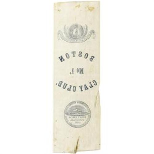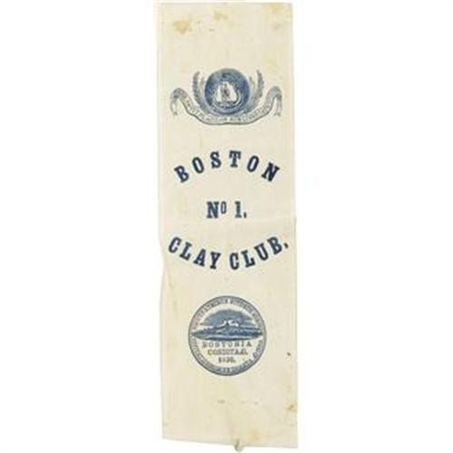 <B>1844 Henry Clay "Boston No. 1 Clay Club" Silk Ribbon.</B></I> This ribbon measures 9.5" long and 3" wide. The words "Boston No 1. Clay Club." are set between two small seals. The first seal depicts the state seal of Massachusetts; a native American bearing a bow and arrow inside a small circle flanked by oak branches. A small ribbon runs below this which says, "<I>Ense Petit Placidam Sublibertate Quietem.</B></I>" [By the sword we seek peace, but peace only under liberty.] The second seal is the Boston Seal and it pictures the city of Boston and the date it was founded, 1630 and also the Latin phrase "<I>Sicut Patribus Sit Deus Nobis</B></I>" [God be with us He was with our Fathers.] This ribbon is in excellent condition; with selvage intact, one small wrinkle on the left edge. Complete, fine fringe, as made, across top and bottom. The blue on white color is unusual and distinctive, and we have not seen this impressive design, unlisted by Sullivan and Fischer, previously.