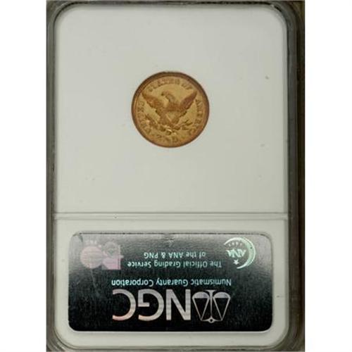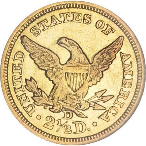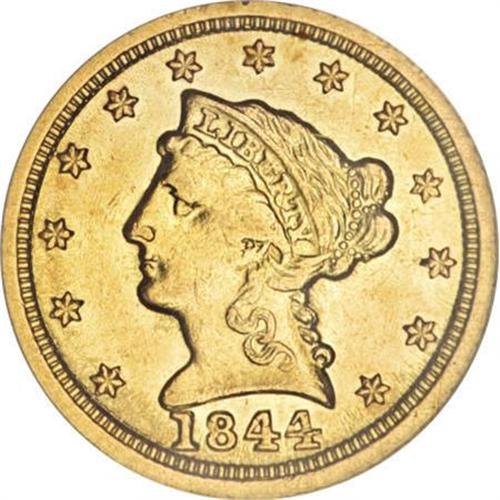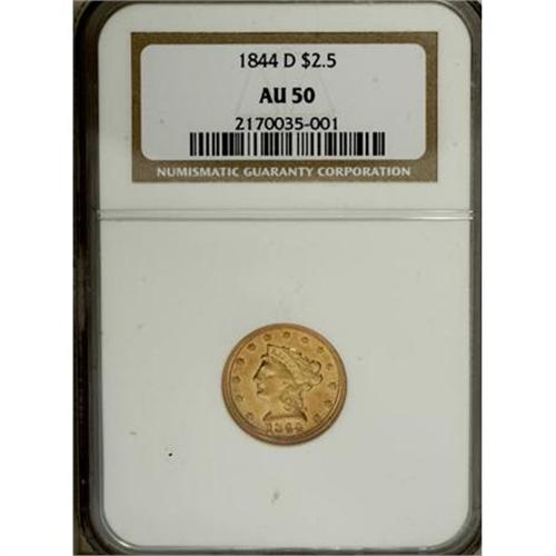 <B>1844-D $2 1/2 AU50 NGC.</B></I> Variety 5-H. This is one of two known varieties for the issue, and is diagnosed by subtle differences in the position of the mintmark. A surprising amount of luster remains evident over the richly toned surfaces. The central details and the eagle's talons, leg, and arrow fletchings are softly struck, as usual on a product of the Dahlonega Mint. The piece is lightly worn with small contact marks and hairlines on each side. <BR><BR><B>Coin Engraver:</B> Christian Gobrecht<BR><BR><b>Shipping:</b> Coins & Currency (<a target="_blank" href="http://www.heritageauctions.com/common/shipping.php">view shipping information</a>)