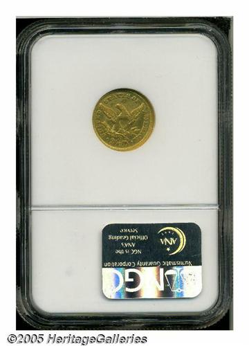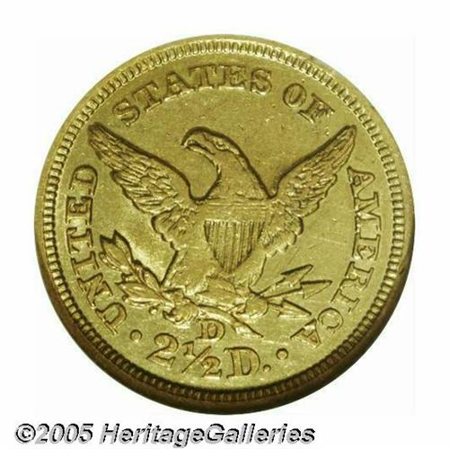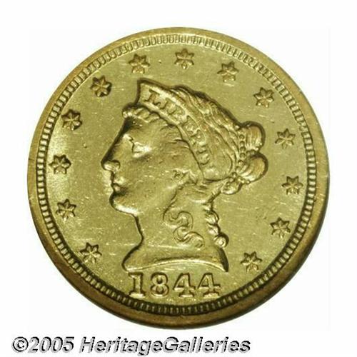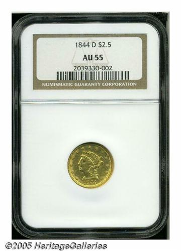 <B>1844-D<$2 1/2> AU55 NGC.</B></I> Variety 5-H. A lovely bright honey-gold piece, the peripheries offer pleasing luster and the surfaces are refreshingly unmarked. The centers are typically impressed, however, the dentils and all thirteen stars are well struck. A handsome example of this difficult, low mintage Dahlonega issue.