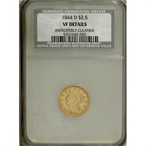<B>1844-D $2 1/2 --Improperly Cleaned--NCS. VF Details.</B></I> Variety 5-H. Despite the comparatively low mintage of 17,332 pieces, this Dahlonega issue is accessible to many collectors. This unnaturally luminous butter-yellow example exhibits moderate wear overall and faint hairlines in the fields. Still, an affordable representative of Dahlonega gold.<BR><BR><B>Coin Engraver:</B> Christian Gobrecht<BR><BR><b>Shipping:</b> Coins & Currency (<a target="_blank" href="http://www.heritageauctions.com/common/shipping.php">view shipping information</a>)