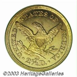 1844-D $2 1/2 MS63 PCGS. Variety 5-H. (per Doug Winter's second edition and revised attribution system). Large Mintmark. Reverse as on 1843 Variety 4-G. The more common of the two varieties of this year.RARITY INFORMATION: This is one of the three or four most common Dahlonega quarter eagles. There are an estimated 175 to 200 pieces known with nine or ten in Uncirculated. The present example is the only piece graded MS63 by PCGS while NGC has also graded one as such.STRIKE: 1844-D quarter eagles are found with a wide variation of strike. Around 15-20% are seen with full strikes and the Green Pond example is one of these. The obverse is very sharp with the curl above the ear of Liberty almost completely full. The reverse is totally defined with full neck, wing, and leg feathers. While these do not generally sell for a premium, in our opinion 1844-D quarter eagles that are this sharply impressed deserve to bring a strong amount over the typical "mushy" example.SURFACES: There are some light hairlines (not from cleaning) on the obverse and a series of small marks below star 7. The reverse also has some light hairlines and a few stray marks in the field above and behind the head of the eagle. The surfaces overall are considerably less abraded than usual.LUSTER: The obverse is frosty with slight graininess in the protected areas around the stars. The reverse is semi-prooflike and when tilted into a light source it displays a confirmed reflectivity.COLORATION: Deep yellow-gold color can be seen on the obverse and reverse. Both sides show a little bit of haze with this being most noticeable in the obverse fields and above the eagle's head.EYE APPEAL: As mentioned above, this is an issue that is often found with a very soft strike. The fact that the Green Pond example is so sharp makes it more desirable than most 1844-D quarter eagles. In addition, this piece has good surfaces and luster below its coloration.COMPARABLES: An NGC MS63 1844-D quarter eagle was sold, prior to being encapsulated, for $30,800 as lot 1748 in David Akers' Pittman II auction in 1998. In our 2003 FUN sale a PCGS MS62 realized $12,075.PEDIGREE: Obtained from an unknown dealer via private treaty; earlier from Hancock and Harwell and Ex: Leon Farmer Collection; George Elliott Collection; Auction '84 (Stack's session), lot 1313; Dr. Arthur Montgomery Collection. This is the plate coin in both the first and second editions of the Winter book on Dahlonega gold and it is listed in the current Condition Census as the finest 1844-D quarter eagle. Important notice: Heritage usually auctions material at the rate of 200-250 lots per hour. On some occasions eBay Live bid software or the Internet may not be able to keep up with the pace of the auction. We recommend placing a realistic absentee bid now as insurance to avoid disappointment. Occasionally the auctioneer may eliminate or reject an eBay Live bid, and the auctioneer may also reopen a lot after the close of the eBay live bidding (usually because we missed an audience bid), and may reject your bid even if it shows you as the winning bidder. By bidding via eBay Live, you agree that Heritage may award the lot to another bidder at its sole discretion under the circumstances described above or any other reasonable circumstances. Also please note that all Heritage lots purchased through eBay Live carry a 20% Buyer's Premium. Please make sure you read the Terms and Conditions before you bid.