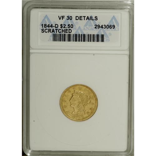 <B>1844-D $2 1/2 --Scratched--ANACS. VF30 Details.</B></I> Variety 5-I. The upper reverse has scrapes, and both sides have several wispy pinscratches. Probably lightly cleaned as well. Just 17,332 pieces fell from the dies.<BR><BR><b>Shipping:</b> Coins & Currency (<a target="_blank" href="http://www.heritageauctions.com/common/shipping.php">view shipping information</a>)