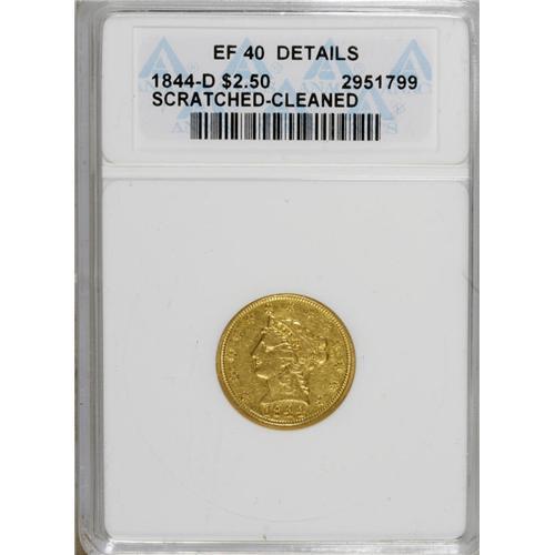 <B>1844-D $2 1/2 --Scratched, Cleaned--ANACS. XF40 Details.</B></I> Variety 5-I. A bit pale from a past dip, and a relatively undistracting thin scratch is present behind Liberty's eye. Noticeable luster remains despite the XF40 sharpness designation.<BR><BR><b>Shipping:</b> Coins & Currency (<a target="_blank" href="http://www.heritageauctions.com/common/shipping.php">view shipping information</a>)