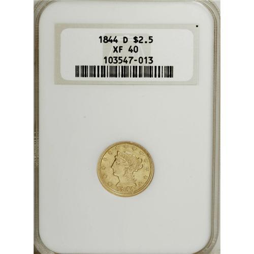 <B>1844-D $2 1/2 XF40 NGC.</B></I> Variety 5-H. A band of bright luster around each border is unusual for the XF40 grade, but this piece is housed in an older generation NGC holder. Some bluntness of detail on the eagle's neck and right (facing) wing combines with light wear. An original piece that will hopefully be left as it is by its next owner.<BR><BR><b>Shipping:</b> Coins & Currency (<a target="_blank" href="http://www.heritageauctions.com/common/shipping.php">view shipping information</a>) <BR><BR><B>Important no