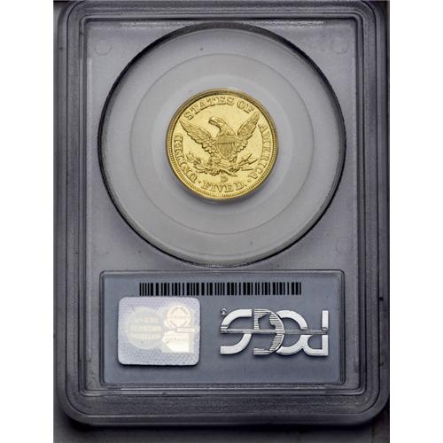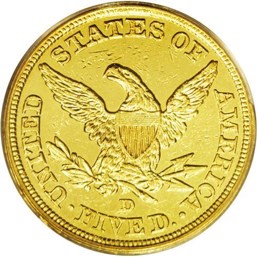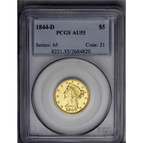 <B>1844-D<$5> AU55 PCGS.</B></I> Variety 11-H. An extremely high-quality example of this issue, one that Winter calls "very scarce in About Uncirculated-53 and quite rare in the highest Uncirculated grades." Much luster, nearly prooflike in its intensity, washes from the pretty, medium-gold surfaces. There are multiple light abrasions on each side, but they are much less severe than usual, and the strike is crisp and bold. Population: 12 in 55, 30 finer (5/06).