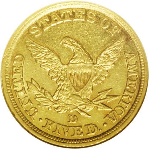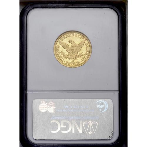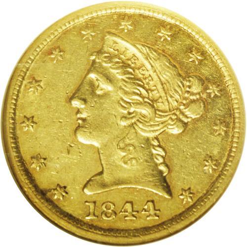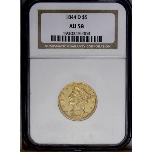 <B>1844-D<$5> AU58 NGC.</B></I> Not Variety 11-H. The obverse die differs, the date is slightly further left than the 'common' variety, with the second 4 centered between the bust and the denticles. Well struck for the mint, Liberty's curls and the fletchings have only a hint of softness. The luster is bright and especially pervasive on the reverse. No distracting marks are present. An opportunity for the Dahlonega type collector to obtain a quality but affordable example. Census: 34 in 58, 18 finer (3/06). <BR><BR><B>Important notice:</B> Heritage usually auctions material at the rate of 200-250 lots per hour. On some occasions eBay Live bid software or the Internet may not be able to keep up with the pace of the auction. We recommend placing a realistic absentee bid now as insurance to avoid disappointment. Occasionally the auctioneer may eliminate or reject an eBay Live bid, and the auctioneer may also reopen a lot after the close of the eBay live bidding (usually because we missed an audience bid), and may reject your bid even if it shows you as the winning bidder. By bidding via eBay Live, you agree that Heritage may award the lot to another bidder at its sole discretion under the circumstances described above or any other reasonable circumstances. Since eBay bids are not shown to us until we open the lot on the floor, we treat those bids just like floor bids. In most cases the floor responds before the eBay bid is presented to us, due to Internet lag time, so for consistency we have made it a policy that floor bids are always considered first over tie eBay live bids. Also please note that all Heritage lots purchased through eBay Live carry a 20% Buyer's Premium. Please make sure you read the Terms and Conditions before you bid. This lot is being auctioned in conjunction with a live floor auction by Heritage Galleries & Auctioneers. All final auction and invoice information will be supplied by Heritage Galleries & Auctioneers, and all other information should be considered preliminary. Lot:2675 <BR><BR><B>Winning Notification and Billing:</B> After the FINAL session in this auction is complete, Heritage will send e-mail and snail mail invoices. This process normally takes several days. All final auction and invoice information will be supplied by Heritage Galleries & Auctioneers, and all other information should be considered preliminary. <BR><BR>This auction will be conducted on a live auction floor and over the Internet through eBay Live. If you choose to place an absentee bid, please take a moment to <font color='#0000ff'><u><a href='http://pages.ebay.com/liveauctions/help/before/laabsentee.html'>learn how eBay Live absentee bidding works</a></u></font><font color='#000000'>