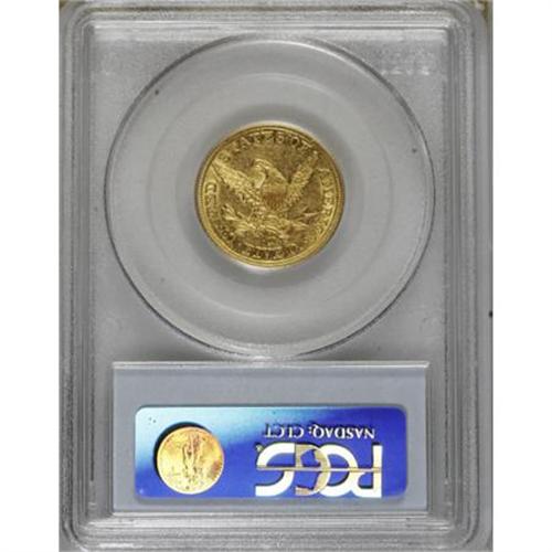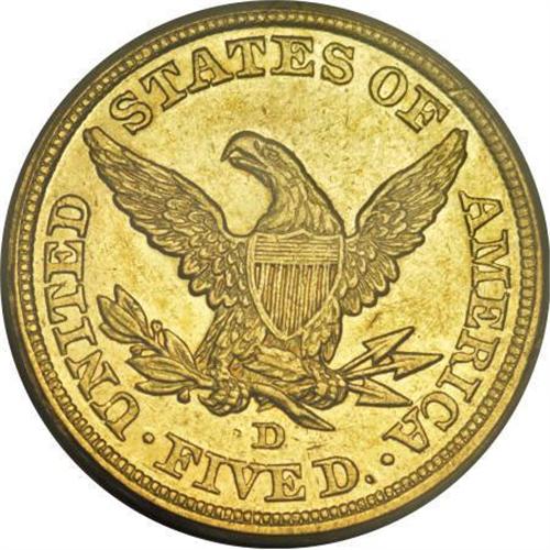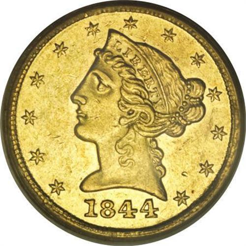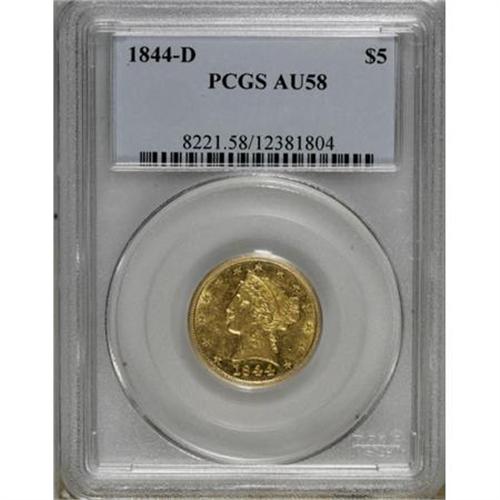 <B>1844-D $5 AU58 PCGS.</B></I> Variety 11-H. The peak of the 1 is repunched. This near-Mint Dahlonega half eagle is sharply struck given its Georgia origins, and the only remotely mentionable mark is a faint thin line between star 1 and the chin. Luster outlines the stars and fills the legends and eagle. Population: 17 in 58, 17 finer (3/08).<BR><BR><B>Coin Engraver:</B> Christian Gobrecht<BR><BR><b>Shipping:</b> Coins & Currency (<a target="_blank" href="http://www.heritageauctions.com/common/shipping.php">view shipping information</a>)