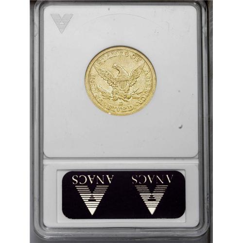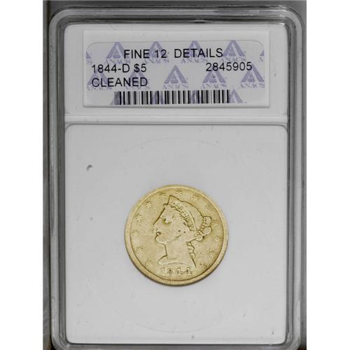 <B>1844-D<$5>--Cleaned--ANACS. Fine 12 Details.</B></I> Variety 11-H. This bright branch mint half eagle is flatly defined on the portrait, though several stars and the eagle's wings display substantial detail. Moderate marks include a reverse rim nick at 7 o'clock. <BR><BR><B>Important notice:</B> Heritage usually auctions material at the rate of 200-250 lots per hour. On some occasions eBay Live bid software or the Internet may not be able to keep up with the pace of the auction. We recommend placing a realistic absentee bid now as insurance to avoid disappointment. Occasionally the auctioneer may eliminate or reject an eBay Live bid, and the auctioneer may also reopen a lot after the close of the eBay live bidding (usually because we missed an audience bid), and may reject your bid even if it shows you as the winning bidder. By bidding via eBay Live, you agree that Heritage may award the lot to another bidder at its sole discretion under the circumstances described above or any other reasonable circumstances. Since eBay bids are not shown to us until we open the lot on the floor, we treat those bids just like floor bids. In most cases the floor responds before the eBay bid is presented to us, due to Internet lag time, so for consistency we have made it a policy that floor bids are always considered first over tie eBay live bids. Also please note that all Heritage lots purchased through eBay Live carry a 20% Buyer's Premium. Please make sure you read the Terms and Conditions before you bid. This lot is being auctioned in conjunction with a live floor auction by Heritage Galleries & Auctioneers. All final auction and invoice information will be supplied by Heritage Galleries & Auctioneers, and all other information should be considered preliminary. Lot:2671 <BR><BR><B>Winning Notification and Billing:</B> After the FINAL session in this auction is complete, Heritage will send e-mail and snail mail invoices. This process normally takes several days. All final auction and invoice information will be supplied by Heritage Galleries & Auctioneers, and all other information should be considered preliminary. <BR><BR>This auction will be conducted on a live auction floor and over the Internet through eBay Live. If you choose to place an absentee bid, please take a moment to <font color='#0000ff'><u><a href='http://pages.ebay.com/liveauctions/help/before/laabsentee.html'>learn how eBay Live absentee bidding works</a></u></font><font color='#000000'>