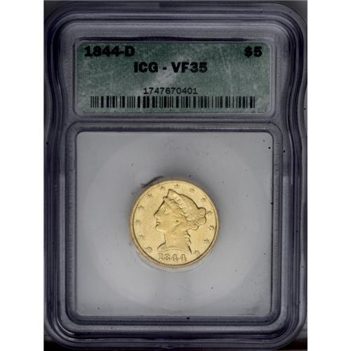 <B>1844-D<$5> VF35 ICG.</B></I> Variety 11-H. Light in color with moderate wear over the highpoints. Anyone seeking a problem-free Dahlonega type coin at an affordable price should consider this mid-grade representative.<BR><I>From The Steve Glenn Collection.</B></I> <BR><BR><B>Important notice:</B> Heritage usually auctions material at the rate of 200-250 lots per hour. On some occasions eBay Live bid software or the Internet may not be able to keep up with the pace of the auction. We recommend placing a realistic absentee bid now as insurance to avoid disappointment. Occasionally the auctioneer may eliminate or reject an eBay Live bid, and the auctioneer may also reopen a lot after the close of the eBay live bidding (usually because we missed an audience bid), and may reject your bid even if it shows you as the winning bidder. By bidding via eBay Live, you agree that Heritage may award the lot to another bidder at its sole discretion under the circumstances described above or any other reasonable circumstances. Since eBay bids are not shown to us until we open the lot on the floor, we treat those bids just like floor bids. In most cases the floor responds before the eBay bid is presented to us, due to Internet lag time, so for consistency we have made it a policy that floor bids are always considered first over tie eBay live bids. Also please note that all Heritage lots purchased through eBay Live carry a 20% Buyer's Premium. Please make sure you read the Terms and Conditions before you bid. This lot is being auctioned in conjunction with a live floor auction by Heritage Galleries & Auctioneers. All final auction and invoice information will be supplied by Heritage Galleries & Auctioneers, and all other information should be considered preliminary. Lot:2673 <BR><BR><B>Winning Notification and Billing:</B> After the FINAL session in this auction is complete, Heritage will send e-mail and snail mail invoices. This process normally takes several days. All final auction and invoice information will be supplied by Heritage Galleries & Auctioneers, and all other information should be considered preliminary. <BR><BR>This auction will be conducted on a live auction floor and over the Internet through eBay Live. If you choose to place an absentee bid, please take a moment to <font color='#0000ff'><u><a href='http://pages.ebay.com/liveauctions/help/before/laabsentee.html'>learn how eBay Live absentee bidding works</a></u></font><font color='#000000'>
