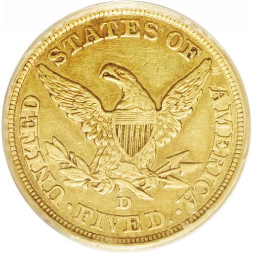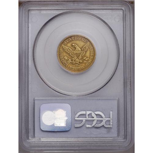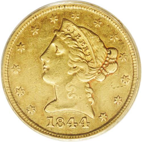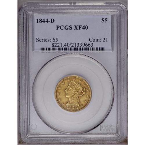 <B>1844-D<$5> XF40 PCGS.</B></I> Variety 11-H. A moderately circulated golden-brown Dahlonega representative. The eye appeal is good for the grade, since abrasions are minimal, and the eagle's plumage is crisp. Liberty's hair curls exhibit typical bluntness, but the stars and denticles are bold.