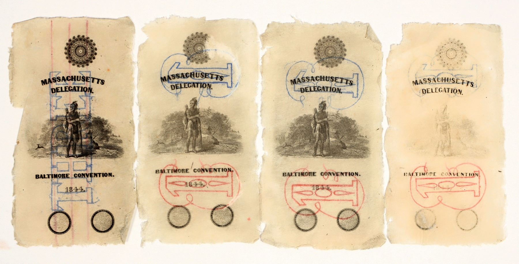 Lot of 4. 1844 Democratic National Convention Tickets Baltimore, Maryland. Native American landscape on each ticket. Massachusetts Delegation. In good condition, but fragile.