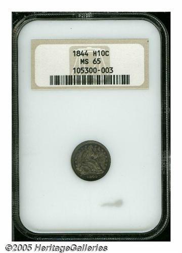 <B>1844<H10C> MS65 NGC.</B></I> Intermingled light and lead-gray and steel-blue patina rests over each side. The design elements are sharply struck, and the surfaces are devoid of mentionable marks. Population: 23 in 65, 12 finer (4/05).