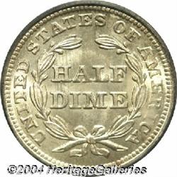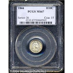 <B>1844<H10C> MS67 PCGS.</B></I> V-3a. This variety shows strong repunching at the 1 in the date, with slightly less visible traces of repunching in the 8 and first 4. This low mintage issue, perhaps overshadowed by its better known "orphan" sister in the dime denomination, is very rare at this level of preservation and is unobtainable any finer. Struck from a lightly clashed reverse die, this Superb Gem displays tremendous luster with hints of golden-tan patina and the strike is second to none. One tiny toning spot is noticed just to the left of Liberty's face and is mentioned for future pedigree reference. Population: 6 in 67, 0 finer (9/04). <BR><BR><B>Important notice:</B> Heritage usually auctions material at the rate of 200-250 lots per hour. On some occasions eBay Live bid software or the Internet may not be able to keep up with the pace of the auction. We recommend placing a realistic absentee bid now as insurance to avoid disappointment. Occasionally the auctioneer may eliminate or reject an eBay Live bid, and the auctioneer may also reopen a lot after the close of the eBay live bidding (usually because we missed an audience bid), and may reject your bid even if it shows you as the winning bidder. By bidding via eBay Live, you agree that Heritage may award the lot to another bidder at its sole discretion under the circumstances described above or any other reasonable circumstances. Since eBay bids are not shown to us until we open the lot on the floor, we treat those bids just like floor bids. In most cases the floor responds before the eBay bid is presented to us, due to Internet lag time, so for consistency we have made it a policy that floor bids are always considered first over tie eBay live bids. Also please note that all Heritage lots purchased through eBay Live carry a 20% Buyer's Premium. Please make sure you read the Terms and Conditions before you bid.