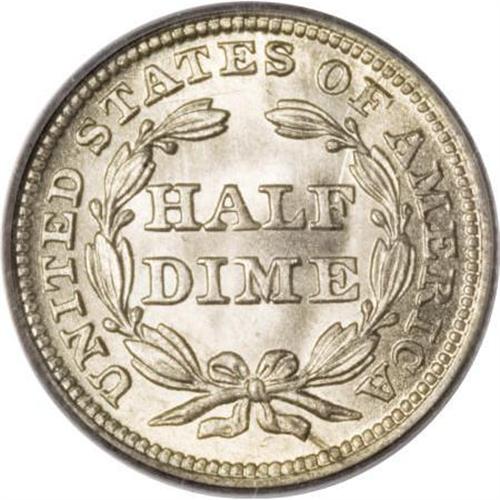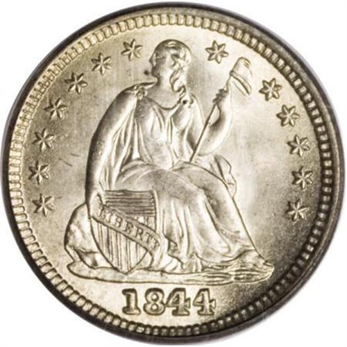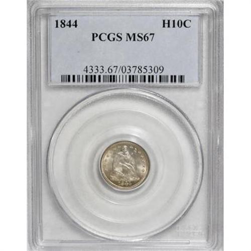 <B>1844 H10C MS67 PCGS.</B></I> V-1. The exact population of this Normal Date variety is not precisely known, but it is clearly much more rare than the V-3 Repunched Date version. This Superb example shows radiant mint luster and crisply struck design elements throughout. The surfaces display lovely silver and light-gold toning, and a brief darker streak at 5:30 on the lower reverse rim. Both sides of the coin are impeccably preserved. Just seven examples of the 1844 half dime have been graded at MS67, by NGC and PCGS combined, with none finer (1/08); but this number is not differentiated according to Valentine variety. <BR><BR><B>Coin Engraver:</B> Christian Gobrecht<BR><BR><b>Shipping:</b> Coins & Currency (<a target="_blank" href="http://www.heritageauctions.com/common/shipping.php">view shipping information</a>)