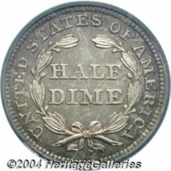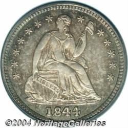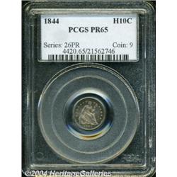 <B>1844<H10C> PR65 Cameo PCGS.</B></I> Triple Date. V-3. Both the 1 and the 8 in the date are tripled punched while dramatic recutting is also seen on the first 4. A mere 4 specimens from this boldly repunched die are estimated by Breen to have been struck as proofs, and the number of proof strikings extant from all dies is thought to be in the neighborhood of 10 pieces. This noticeably striated and cameoed specimen is intricately detailed and exhibits dappled violet toning that yields to flashes of sea-green at the margins. Population: 1 in 65, 0 finer (7/04). <BR><BR><B>Important notice:</B> Heritage usually auctions material at the rate of 200-250 lots per hour. On some occasions eBay Live bid software or the Internet may not be able to keep up with the pace of the auction. We recommend placing a realistic absentee bid now as insurance to avoid disappointment. Occasionally the auctioneer may eliminate or reject an eBay Live bid, and the auctioneer may also reopen a lot after the close of the eBay live bidding (usually because we missed an audience bid), and may reject your bid even if it shows you as the winning bidder. By bidding via eBay Live, you agree that Heritage may award the lot to another bidder at its sole discretion under the circumstances described above or any other reasonable circumstances. Since eBay bids are not shown to us until we open the lot on the floor, we treat those bids just like floor bids. In most cases the floor responds before the eBay bid is presented to us, due to Internet lag time, so for consistency we have made it a policy that floor bids are always considered first over tie eBay live bids. Also please note that all Heritage lots purchased through eBay Live carry a 20% Buyer's Premium. Please make sure you read the Terms and Conditions before you bid. </span></font></tr></table></td></tr></table>