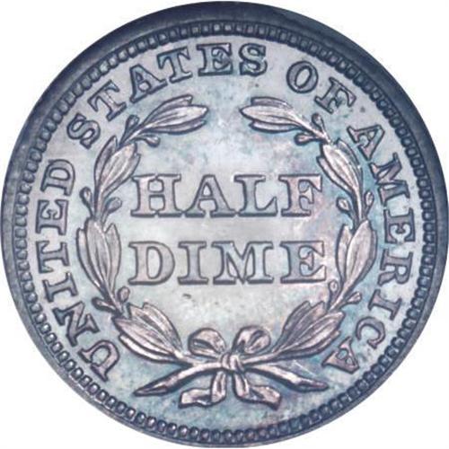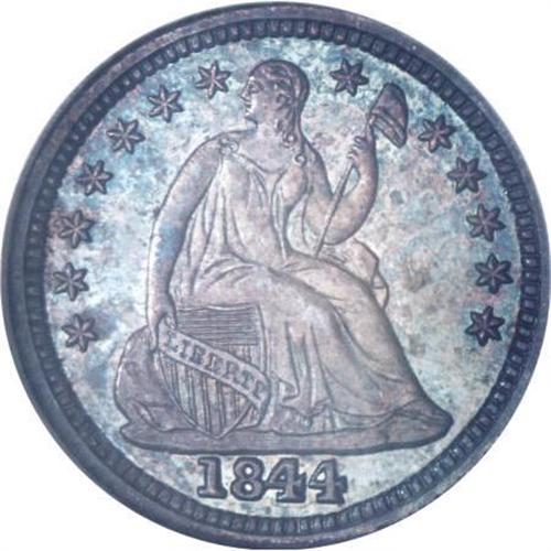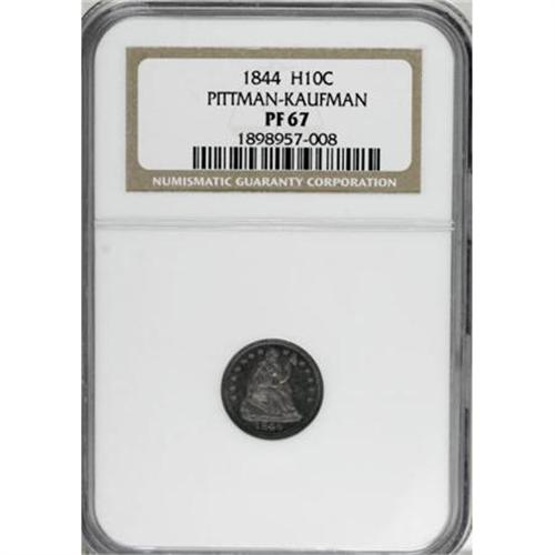 <B>1844 H10C PR67 NGC.</B></I> Ex: Pittman-Kaufman. The 1844 proof half dime in the Phil Kaufman cabinet is the finest certified specimen certified by NGC or PCGS. It is pedigreed to the John Jay Pittman Collection sold by David Akers Numismatics, Inc., October 21-23, 1997. <BR><BR>The Pittman coin was part of an 1844 proof set "in the original case of issue." In his description of the piece, Akers says: "In Proof, this issue is a great rarity; only 6-8 proofs are known to exist." NGC and PCGS have certified a total of 13 specimens (of course, some of these are likely resubmissions). The former service has seen a PR63, four PR64s, two PR65s, and a PR67, the Pittman-Kaufman piece <I>finest certified</B></I>. PCGS has graded two PR62 coins, a PR63, a PR65 Cameo, and a PR66. Out of 13 certified submissions, we are only able to track down five different coins that have been graded by these two services.<BR><BR> The 1844 proof half dime is thought by some to consist of four varieties, though there is no universal agreement on this. The appropriate Valentine numbers and abbreviated descriptions are:<BR><BR>Valentine-1. Normal date placed high, slanting down to the right.<BR>Valentine-2. Normal low date.<BR>Valentine-3. Repunched 184.<BR>Valentine-4. Repunched date, different than V-3.<BR><BR>The following 1844 proof half dime roster is categorized by Valentine numbers:<BR><BR><B>Valentine-1<BR><BR>1. PR67 NGC.</B></I> Numismatic Gallery (4/1948); John Jay Pittman (David Akers, 10/1997), lot 833; <B>Philip Kaufman</B></I>. Part of Pittman's 1844 proof set. The Seated silver coins have been kept intact by Phil Kaufman.<BR><BR><B>2. PR64 NGC.</B></I> Lester Merkin (4/1966), lot 77; 1971 ANA (Stack's), lot 622; Stack's (8/1973); Norweb Collection (Bowers and Merena, 10/1987), lot 337; Bowers (3/1998), lot 503.<BR><B><BR>3. PR65 NGC.</B></I> American Numismatic Rarities (9/2003), lot 218; Stack's (1/2007), lot 366; Stack's (3/2007), lot 498.<BR><BR><B>4. PR64 NGC.</B></I> New England (3/1977), lot 43; Richmond Collection (David Lawrence, 3/2005), lot 1085; Heritage (4/2006), lot 372; Heritage (6/2006), lot 24135; Heritage (7/2006), lot 23196; Heritage (8/2006), lot 24273; Stack's (8/2007), lot 410.<BR><BR><B>5. Proof.</B></I> Smithsonian Institution.<BR><BR><B><I>Additional Appearances</B></I></B></I>: <BR><BR><B>A. Proof. </B></I>Stack's (4/1978), lot 435.<BR><BR><B>B. Proof.</B></I> F.C.C. Boyd, World's Greatest Collection (Numismatic Gallery, 1/1945), lot 234. Not plated.<BR><BR><B>Valentine-2</B></I><BR><BR>Probably not struck in proof, despite several pieces listed in Breen's <I>Proof Encyclopedia</B></I>. The Eliasberg specimen is clearly not a proof. The May 1952 David Bullowa specimen has not been seen, nor has lot 235 in the World's Greatest Collection sale. The Lester Merkin April 1966 coin that Breen recorded as V-2 turned up in the Norweb Collection, and is an example of V-1.<BR><B><BR>Valentine-3<BR><BR>6. PR65 Cameo PCGS.</B></I> Harlan P. Smith (S.H. and H. Chapman, 5/1906); John M. Clapp; Clapp Estate (1942); Louis E. Eliasberg, Sr.; Eliasberg Estate (Bowers and Merena, 5/1996), lot 960; Superior (1/2004), lot 173; Heritage (6/2004), lot 6036; Heritage (8/2004), lot 5642; Heritage (9/2004), lot 11644; Heritage (2/2005), lot 6156, Heritage (3/2005), lot 23182.<BR><B><BR>7. Proof.</B></I> American Numismatic Society.<BR><BR><B>Not in Valentine, called V-4 today.<BR><BR>8. Proof</B></I>. New Netherlands Coin Co. (51st Sale, 6/1958), lot 558. Not plated<BR><BR><B><I>Additional Appearance</B></I></B></I>: <BR><BR><B>C. Proof.</B></I> Pine Tree (2/1975), lot 122. Described as a "Marked Gem Proof." The coin is plated actual size. These two pieces may be the same.<BR><BR> The fully mirrored fields of the remarkable Superb Gem that we offer in this lot yield impressive contrast with the mildly frosted motifs, especially when the coin is rotated under a light source. Moreover, beautiful cobalt-blue and reddish-gold toning adorns both sides, and a powerful strike results in sharp delineation on all of the design elements. The surfaces are impeccably preserved, heightening even more the coin's outstanding beauty. A tiny as-made planchet depression beneath the I in DIME and a faint linear mark between the stem and the last A in AMERICA serve to identify this particular piece. A simply amazing example of this rare proof.<BR><I>From The Phil Kaufman Collection of Early Seated Proof Sets, Part Two.</B></I><BR><BR><B>Coin Engraver:</B> Christian Gobrecht<BR><BR><b>Shipping:</b> Coins & Currency (<a target="_blank" href="http://www.heritageauctions.com/common/shipping.php">view shipping information</a>)