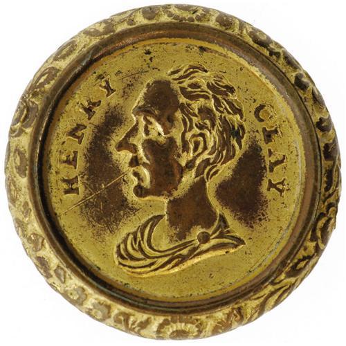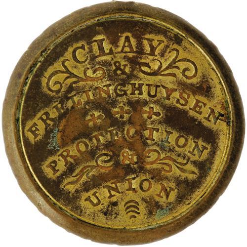 <B>1844 Henry Clay Hollow Brass Shell Medalet.</B></I> Listed as HC 1844-44, measuring 26mm. Features a togated bust facing left with the engraver's initials on the truncation. The reverse reads "Clay & Frelinghuysen Protection & Union." Due to its hollow nature, this medal often suffers from some dents and crushing; this example is no exception. The reverse has several small dents, both sides have some slight wearing away of the gilt coloring on the areas of high relief. Otherwise, a handsome example of this Clay staple.