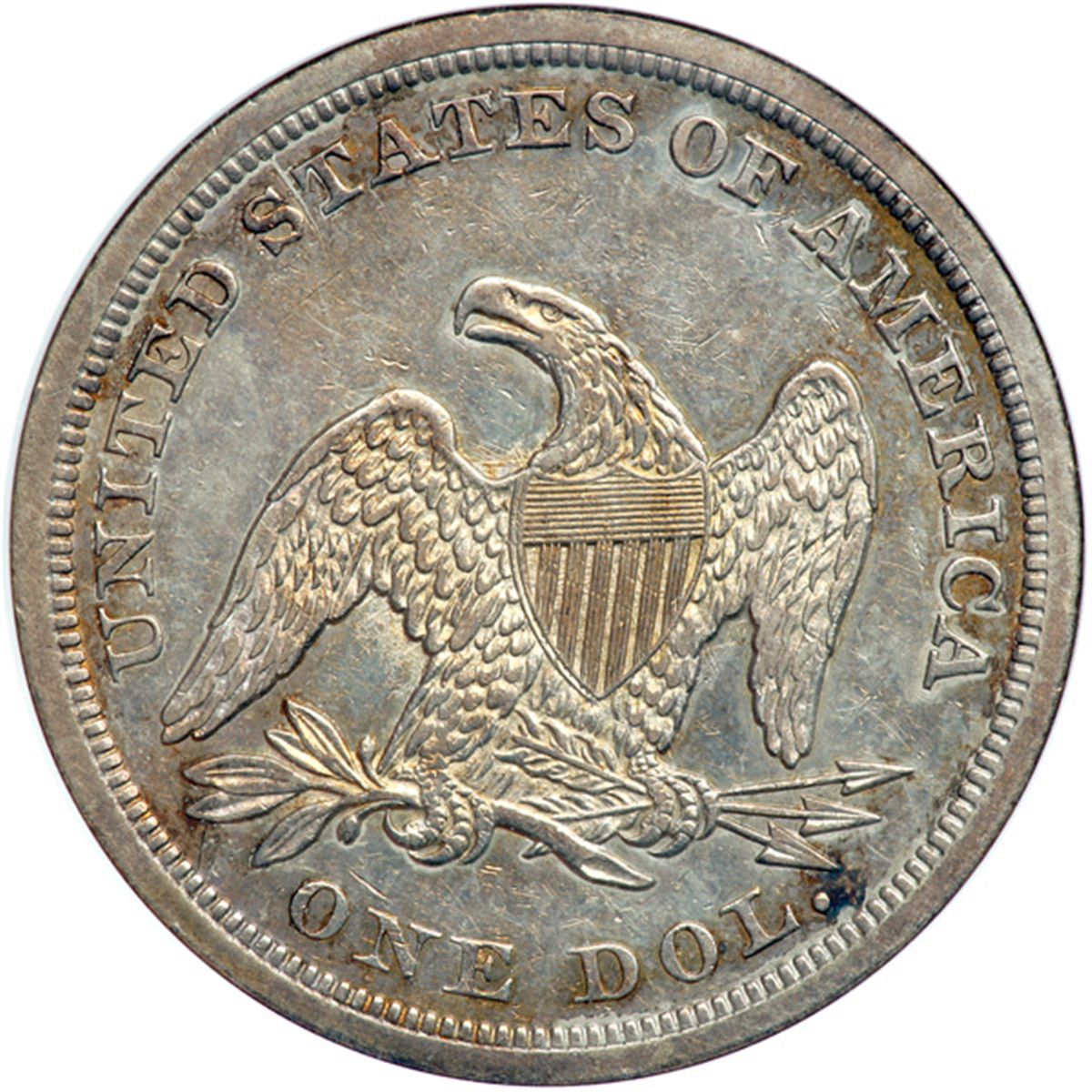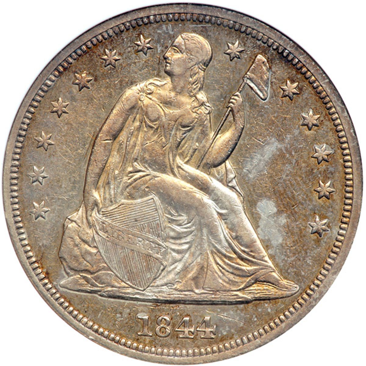 1844 Liberty Seated Dollar. ANACS graded AU-53. Light golden toning. A scarce issue that is seldom available in choice AU condition. Very attractive. Only 20,000 struck.