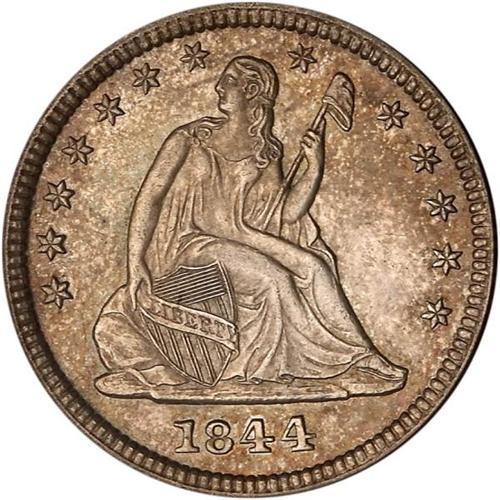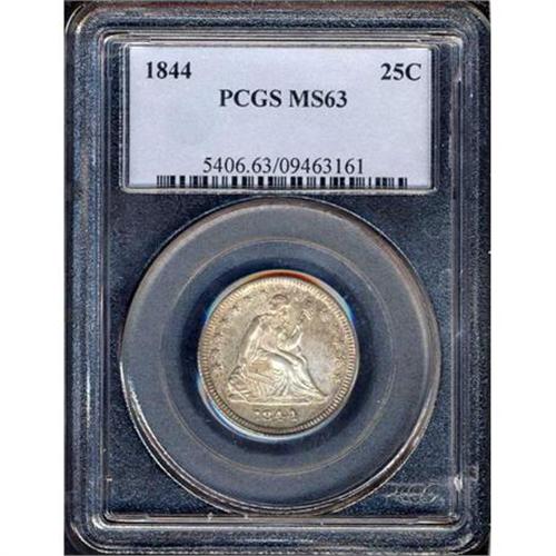 <b>1844 Liberty Seated Quarter Dollar. PCGS graded MS63.</b> Lovely variegated toning atop full mint bloom on both sides. Close to fully struck, with merely a hint of softness at the rim dentils and a few stars (but boldness throughout the eagle and Liberty). A scarce date in Mint quality since most found their way into circulation.