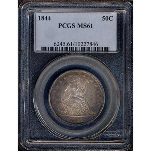 <b>1844 Liberty Seated Half Dollar. PCGS graded MS61.</b> Well struck with luster aplenty under the natural gray and shimmering blue patina. A carefully graded example of the early No Motto design <b>(PCGS # 6245)</b> <i>