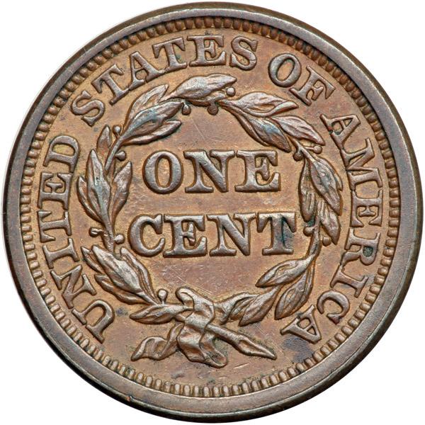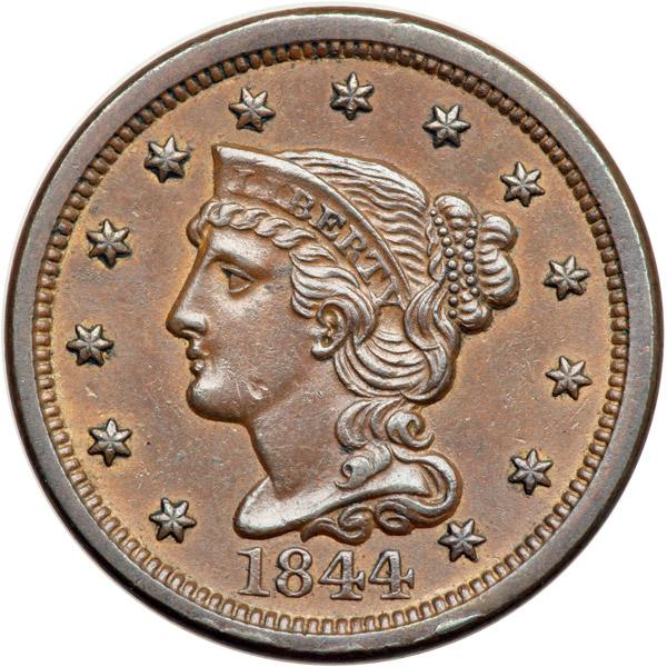 1844 N-1 R1 AU50. Frosty tan and light brown with chocolate toning on the devices. A planchet chip on the jaw over the throat and a hairline scratch above the end of the wreath stem, plus a spot of darker toning at the T in CENT and another spot right of the second A in AMERICA are the notable marks. M-LDS with tiny rim cud breaks under the date and star 13.