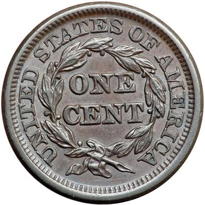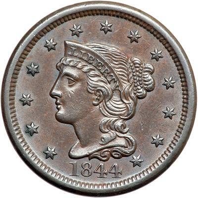 1844 N-1 R1. AU-50. Frosty steel and chocolate brown. An attractive cent with only a few trivial contact marks, mostly on the cheek. M-LDS, die state d, with fine die cracks on both sides.