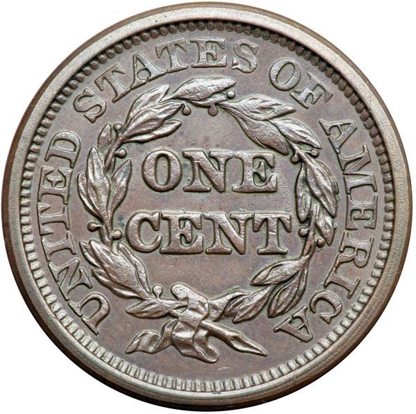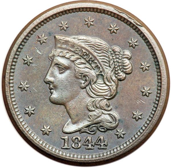 1844 N-3 R2 Repunched 18 AU55. Glossy bluish steel brown. There is very little if any actual wear on this cent, but the strike is a bit soft on the highpoints, as often seen on this die variety. The only marks are a light nick in the field under star 5, a small carbon spot just right of the inner curl, and another in the field touching the lowest curl. M-LDS, die state d. The fields are smooth and reflective and covered with fine die polishing lines thanks to a fresh die polishing. The repunching at the 18 is gone and a series of tiny but clearly defined rim cud breaks show at stars 8-9. Covered with a very thin layer of lacquer. DWH #0939.