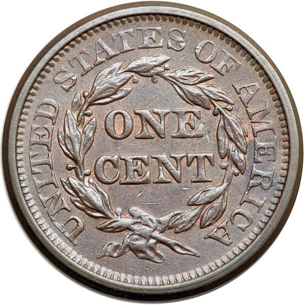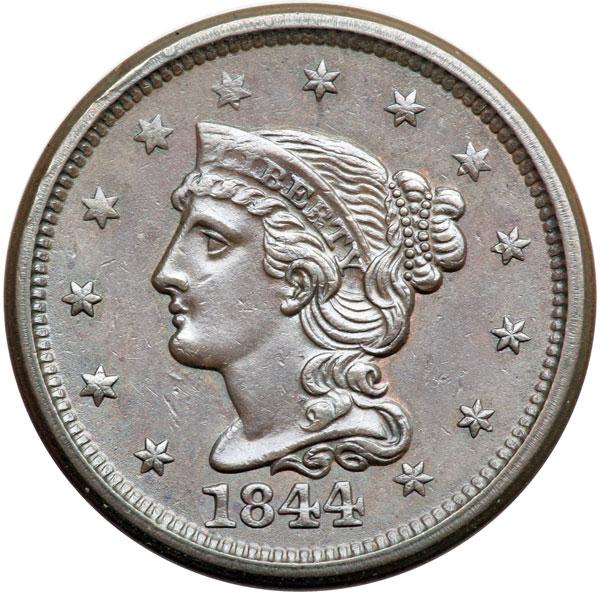 1844 N-4 R1+ AU55. Lustrous steel brown and chocolate with traces of mint red on both sides. The fields are satiny and the eye appeal is excellent. LDS, die state d, with narrow rim cud breaks at stars 4-6 and a fine die crack passing through the top of the F in OF. The coronet over LIB is softly struck but everything else is nicely impressed. DWH #3466.