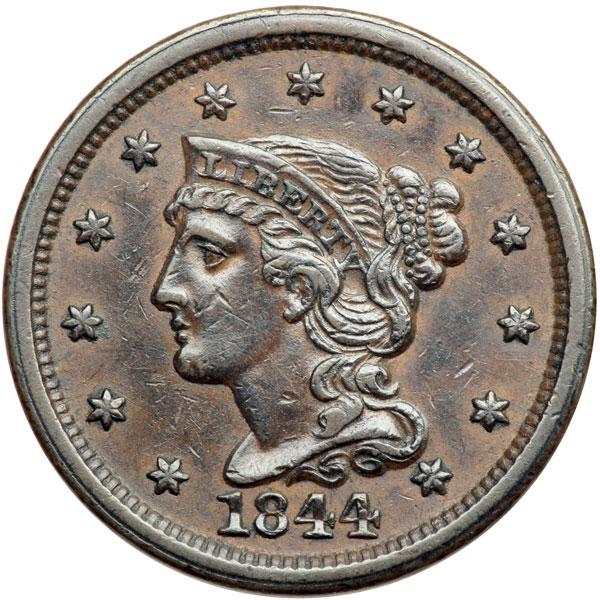 1844 N-7 R2+ VF35. Slightly sharper with a couple light nicks on the cheek and neck. The best identifying mark is a tiny rim nick over the right side of the second A in AMERICA. Glossy dark steel brown highpoints with frosty light steel brown covering the protected areas. EDS, die state a. Without the obverse rim cud or the small lump in the field that touches the bottom of the main curl. DWH #0948.