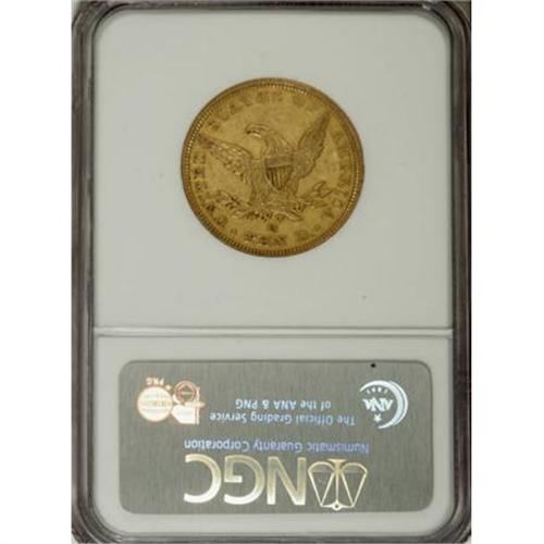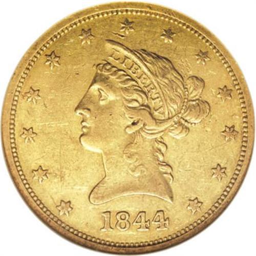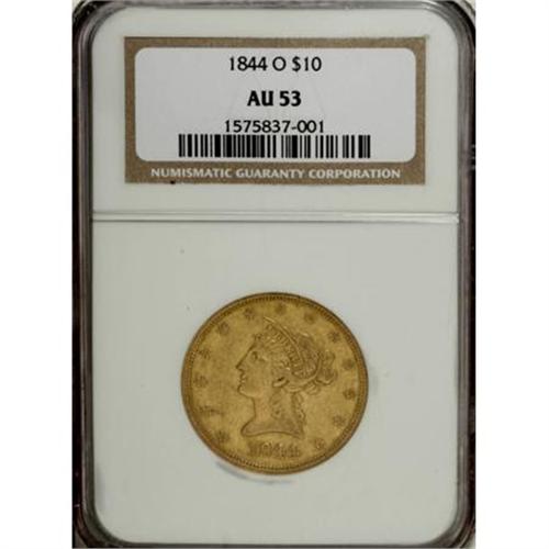 <B>1844-O $10 AU53 NGC.</B></I> Douglas Winter (2006) writes: "The 1844-O ... can be found with relative ease in VF and EF grades. It becomes scarce in the lower AU grades and is rare in the higher AU range." Traces of luster reside in the recesses of this honey-gold AU53 specimen, and good definition occurs on most of the design elements. A few light marks are scattered over each side, but this coin has escaped the heavy abrasions seen on most examples.<BR><BR><B>Coin Engraver:</B> Christian Gobrecht<BR><BR><b>Shipping:</b> Coins & Currency (<a target="_blank" href="http://www.heritageauctions.com/common/shipping.php">view shipping information</a>\)