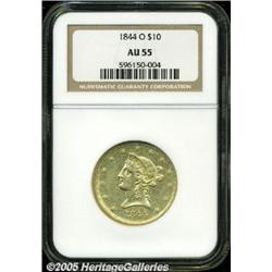 <B>1844-O $10 AU55 NGC.</B></I> While a relatively common coin in VF and even XF condition, the '44-O is a condition scarcity in AU. This is an especially Choice piece that has bright, lustrous surfaces. The strike is well defined except on Liberty's hair curls, and there are a few small field marks and scratches scattered about.