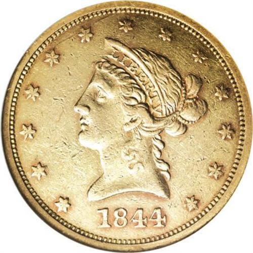 <B>1844-O $10 AU55 NGC.</B></I> The 1844-O ten dollar is relatively scarce in all grades. The Choice AU specimen displays bright yellow-gold surfaces that are imbued with traces of reddish-orange, particularly on the reverse. Except for light high-point wear, the design elements exhibit good definition. The normal assortment of minute marks are noted over each side. Census: 86 in 55, 54 finer (11/07).<BR><BR><B>Coin Engraver:</B> Christian Gobrecht<BR><BR><b>Shipping:</b> Coins & Currency (<a target="_blank" href="http://www.heritageauctions.com/common/shipping.php">view shipping information</a>)