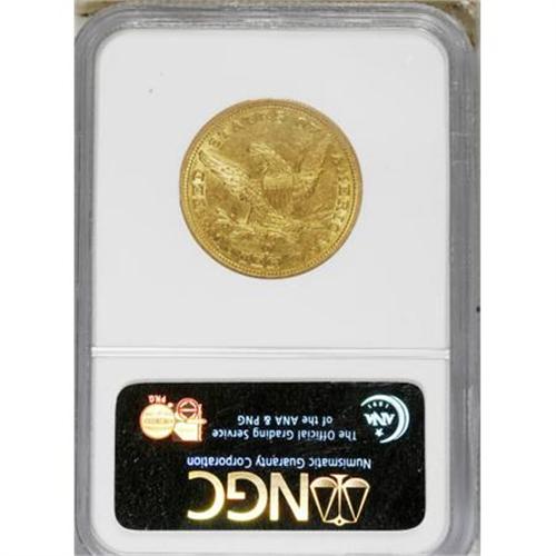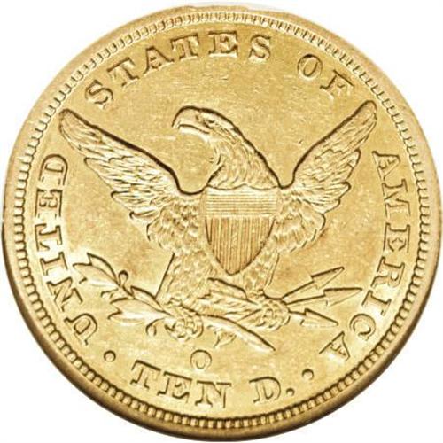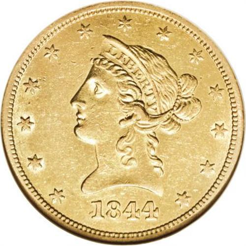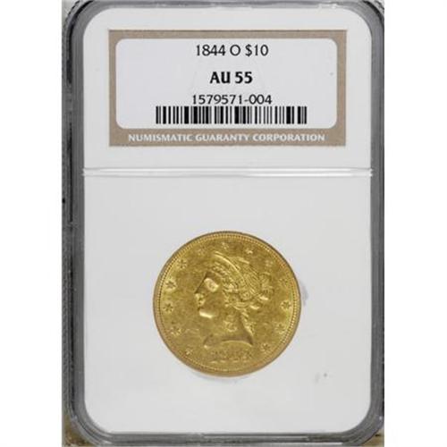 <B>1844-O $10 AU55 NGC.</B></I> Enticing khaki-gold coloration adorns the minimally worn surfaces of this Choice AU survivor from the New Orleans Mint. Well struck with glints of luster near the borders and devices. AU examples are no longer rare, since the recovery of the <I>S.S. Republic </B></I>shipwreck, but they remain scarce, and Mint State pieces continue to be rare. <BR><BR><B>Coin Engraver:</B> Christian Gobrecht<BR><BR><b>Shipping:</b> Coins & Currency (<a target="_blank" href="http://www.heritageauctions.com/common/shipping.php">view shipping information</a>)