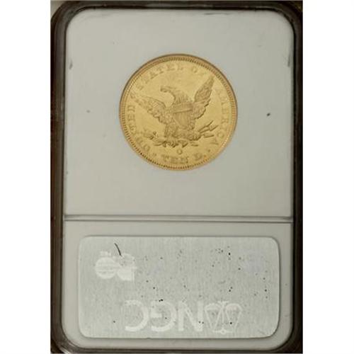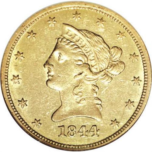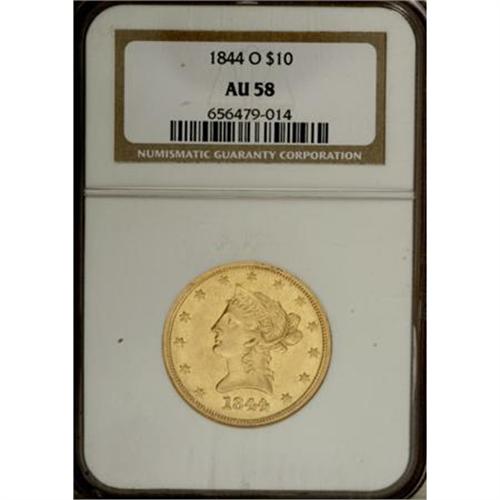 <B>1844-O $10 AU58 NGC.</B></I> Bright green-gold surfaces characterize this nearly Mint State example, with lots of nice luster retained in the protected areas. There are a few minor marks as is typical for the grade, but the devices are well-defined and the overall appeal is very positive. This example is rarely available in Mint State. Census: 44 in 58, 10 finer (12/07).<BR><BR><B>Coin Engraver:</B> Christian Gobrecht<BR><BR><b>Shipping:</b> Coins & Currency (<a target="_blank" href="http://www.heritageauctions.com/common/shipping.php">view shipping information</a>)