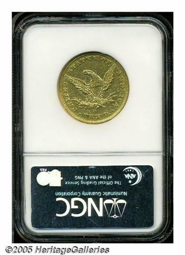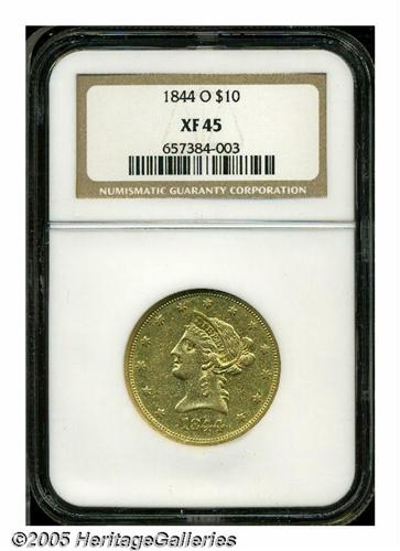 <B>1844-O<$10> XF45 NGC.</B></I> A nicely detailed and bright representative. The fields and portrait are typically abraded. The mintmark is recut within the loop. A scarce O-mint issue.