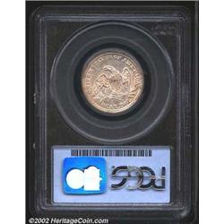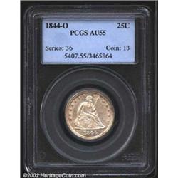 1844-O 25C AU55 PCGS. Breen-3958. The first 4 in the date has been repunched. The streaky and dusky tan-brown patina leaves much of the surfaces untoned. From a sharp strike with ample luster that can't quite penetrate the field to reach the major devices. The surfaces have wispy abrasions from a short stay in circulation, but there are no singular blemishes of any note. A surprisingly scarce date. Population: 6 in 55, 14 finer (11/01). Important notice: We expect to be auctioning lots at the rate of 200-250 per hour. Sometimes eBay Premier live bid software cannot keep up with that pace, so we strongly recommend that you place a realistic proxy bid now as insurance to avoid disappointment. Also please note that all Heritage/CAA lots purchased through eBay Premier carry a 20% Buyer's Premium.