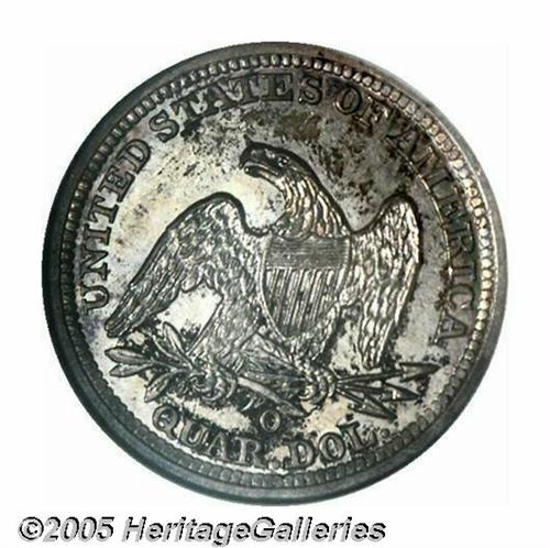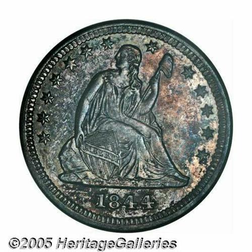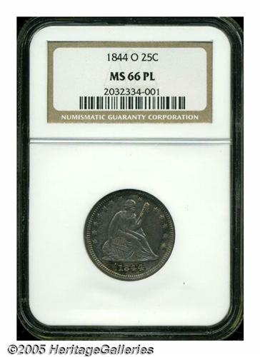 <B>1844-O<25C> MS66 Prooflike NGC.</B></I> With a sizeable original delivery of 740,000 pieces, the 1844-O is a readily obtainable issue in grades up to and including About Uncirculated. As Southerners saved very few of these coins at the time of their delivery, this specter of commonness fades quickly as one passes into the Mint State grades. While any Uncirculated survivor of this O-mint issue should be considered a rare find, the present Gem is in a class all its own. Sharply impressed by New Orleans mint standards, every star centril, hair feature, and feather detail rises powerfully above the nicely mirrored fields. While the pristine surfaces do full justice to the respected grade designation, we call attention to a small abrasion on Liberty's cheek and a rim cut above the first A in AMERICA that should be of obvious importance for pedigree purposes. Mottled steel-gray, lilac, and charcoal patination rounds out the memorable eye appeal of this solid Condition Census example. Population: 1 in 66 Prooflike, 0 finer (4/05).