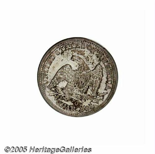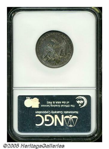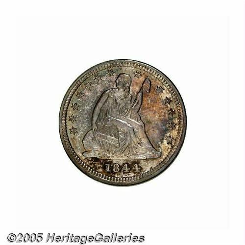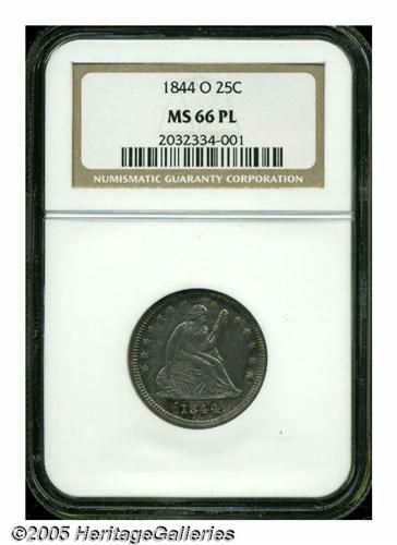 <B>1844-O<25C> MS66 Prooflike NGC.</B></I> With a sizeable original delivery of 740,000 pieces, the 1844-O is a readily obtainable issue in grades up to and including About Uncirculated. As Southerners saved very few of these coins at the time of their delivery, this specter of commonness fades quickly as one passes into the Mint State grades. While any Uncirculated survivor of this O-mint issue should be considered a rare find, the present Gem is in a class all its own. Sharply impressed by New Orleans mint standards, every star centril, hair feature, and feather detail rises powerfully above the nicely mirrored fields. While the pristine surfaces do full justice to the respected grade designation, we call attention to a tiny mark on Liberty's cheek and a rim nick above the first A in AMERICA that should be of obvious importance for pedigree purposes. Mottled steel-gray, lilac, and charcoal patination rounds out the memorable eye appeal. The finest certified by either NGC or PCGS, ahead of two PCGS MS65 examples. Population: 1 in 66 Prooflike, 0 finer (6/05).