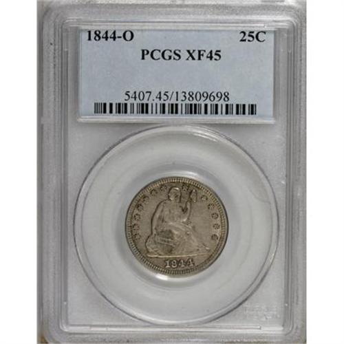 <B>1844-O 25C XF45 PCGS.</B></I> PCGS Population (3/34). NGC Census: (7/27). Mintage: 740,000. Numismedia Wsl. Price for NGC/PCGS coin in XF45: $220. (#5407)<BR><BR><B>Coin Engraver:</B> Christian Gobrecht<BR><BR><b>Shipping:</b> Coins & Currency (<a target="_blank" href="http://www.heritageauctions.com/common/shipping.php">view shipping information</a>)