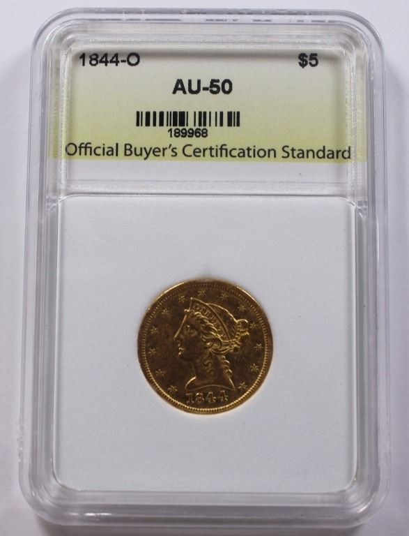 OBCS GRADED, AU, RARE EARLY NEW ORLEANS MINT GOLD! NICE COIN! ESTIMATE $875-$975