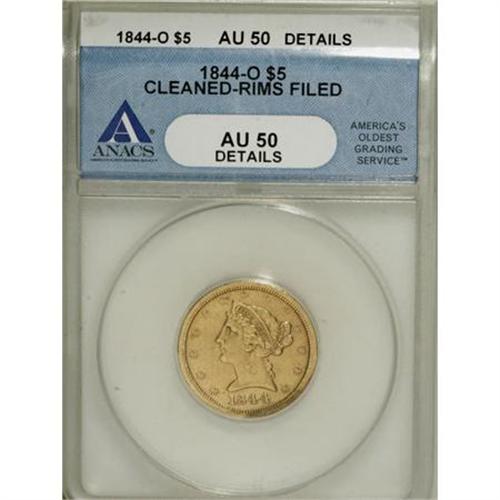 <B>1844-O $5 --Cleaned, Rim Filed--ANACS. AU50 Details.</B></I> NGC Census: (45/320). PCGS Population (39/89). Mintage: 364,600. Numismedia Wsl. Price for NGC/PCGS coin in AU50: $500. (#8222)<BR><BR><B>Coin Engraver:</B> Christian Gobrecht<BR><BR><b>Shipping:</b> Coins & Currency (<a target="_blank" href="http://www.heritageauctions.com/common/shipping.php">view shipping information</a>)