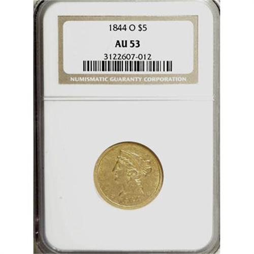 <B>1844-O $5 AU53 NGC.</B></I> NGC Census: (61/262). PCGS Population (17/73). Mintage: 364,600. Numismedia Wsl. Price for NGC/PCGS coin in AU53: $725. (#8222)<BR><BR><B>Coin Engraver:</B> Christian Gobrecht<BR><BR><b>Shipping:</b> Coins & Currency (<a target="_blank" href="http://www.heritageauctions.com/common/shipping.php">view shipping information</a>)