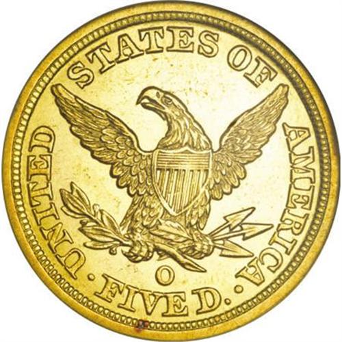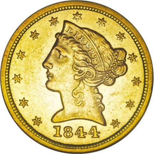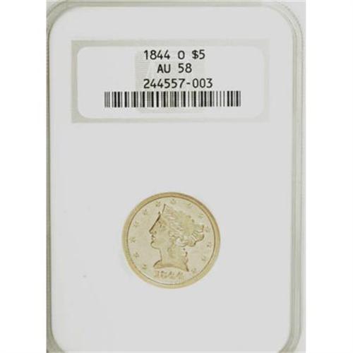 <B>1844-O $5 AU58 NGC.</B></I> This intricately struck near-Mint New Orleans five is lustrous except for the open fields. Unexpectedly free from contact aside from faint marks near the chin. The reverse rim has a small ruby-red spot at 6:30. Expect fierce competition for this attractive example. Certified in a prior generation holder.<BR><BR><B>Coin Engraver:</B> Christian Gobrecht<BR><BR><b>Shipping:</b> Coins & Currency (<a target="_blank" href="http://www.heritageauctions.com/common/shipping.php">view shipping information</a>)