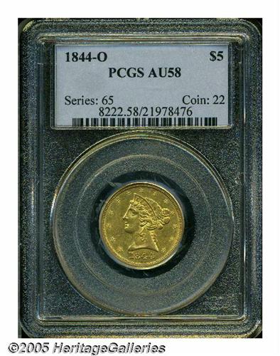 <B>1844-O<$5> AU58 PCGS.</B></I> Well struck, satiny, and slightly worn, with a few wispy hairlines evident in the obverse and reverse fields. A relatively common New Orleans issue, but scarce at or above the current grade level. Population: 16 in 58, 23 finer (5/05).