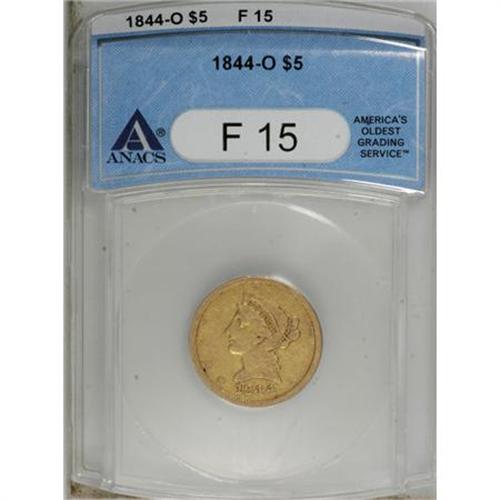 <B>1844-O $5 F15 ANACS.</B></I> NGC Census: (1/495). PCGS Population (4/255). Mintage: 364,600. Numismedia Wsl. Price for NGC/PCGS coin in F15: $193. (#8222)<BR><BR><b>Shipping:</b> Coins & Currency (<a target="_blank" href="http://www.heritageauctions.com/common/shipping.php">view shipping information</a>)