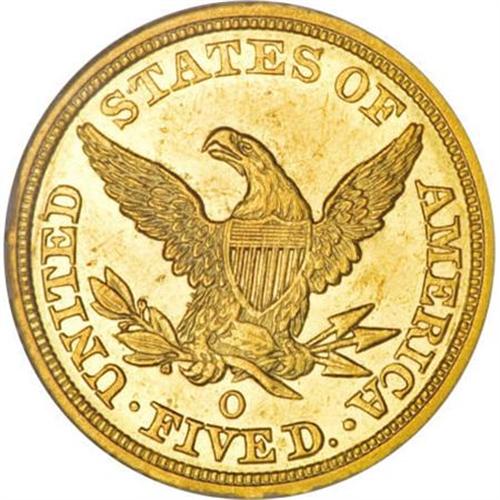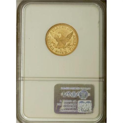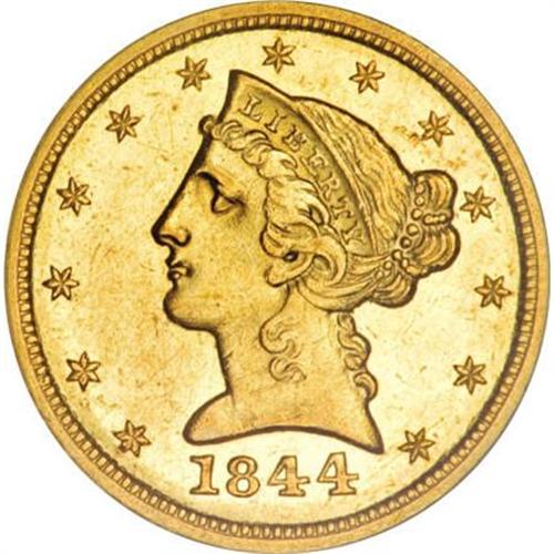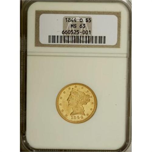 <B>1844-O $5 MS63 NGC.</B></I> The 1844-O is the most common No Motto half eagle from the New Orleans Mint, due largely to its production of 364,600 pieces. It is readily obtainable in Very fine and Extremely Fine, and even About Uncirculated coins can be located without too much trouble. Mint State coins are scarce up to the Select level, at which point they become rare.<BR> This MS63 example displays bright peach-gold surfaces that yield a light green cast. A well executed strike imparts sharp definition on the design elements, except for the usually seen softness on the eagle's neck. A scattering of minute marks, none of which are worthy of individual mention, defines the grade. All in all, a highly attractive example. Census: 9 in 63, 6 finer (12/07).<BR><BR><B>Coin Engraver:</B> Christian Gobrecht<BR><BR><b>Shipping:</b> Coins & Currency (<a target="_blank" href="http://www.heritageauctions.com/common/shipping.php">view shipping information</a>)