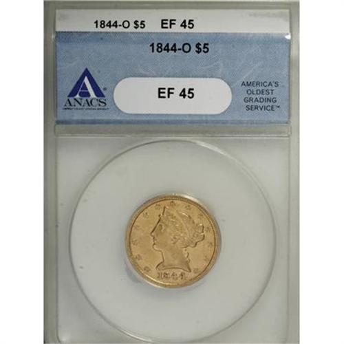 <B>1844-O $5 XF45 ANACS.</B></I> . NGC Census: (91/373). PCGS Population (50/130). Mintage: 364,600. Numismedia Wsl. Price for NGC/PCGS coin in XF45: $409. (#8222)<BR><BR><B>Coin Engraver:</B> Christian Gobrecht<BR><BR><b>Shipping:</b> Coins & Currency (<a target="_blank" href="http://www.heritageauctions.com/common/shipping.php">view shipping information</a>)